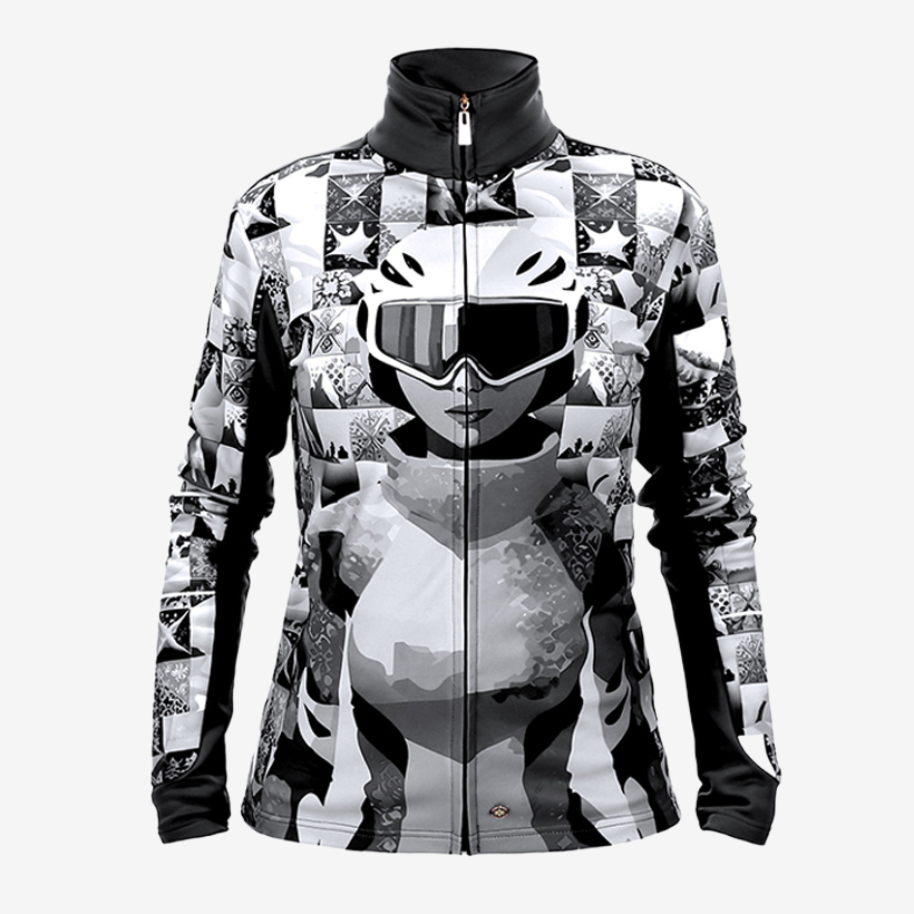 Na hrudi dominuje velký portrét lyžařky v kombinéze, helmě a brýlích – motiv, který dodává mladistvou energii a sportovní šmrnc.